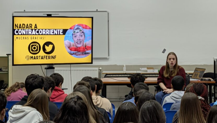 Nos dio una charla profundamente inspiradora en la que compartió sus orígenes y sus primeros pasos en la natación, destacando cómo la constancia y la pasión marcaron su camino desde edades tempranas. A lo largo de su intervención, abordó con cercanía las dificultades encontradas en su trayectoria deportiva y la importancia de la superación personal ante los obstáculos. Así mismo, puso en valor la gestión de las emociones como herramientas clave para el rendimiento y el bienestar. Marta animó al alumnado a fijarse metas realistas y a perseverar con disciplina y confianza. Su testimonio dejó un mensaje motivador sobre el esfuerzo, la resiliencia y el crecimiento personal dentro y fuera del deporte.